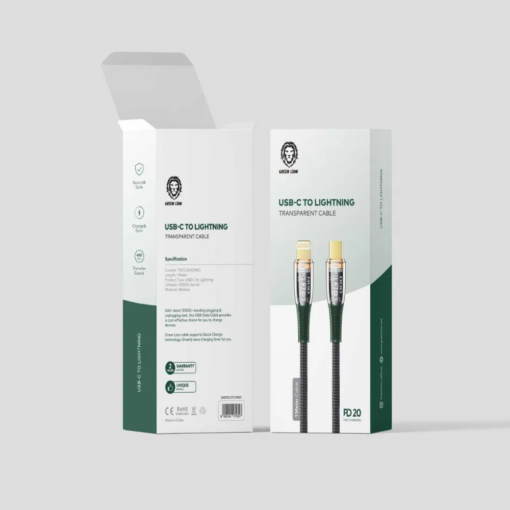 Green Lion Braided USB-C to Lightning Transparent Cable 1M PD 20W