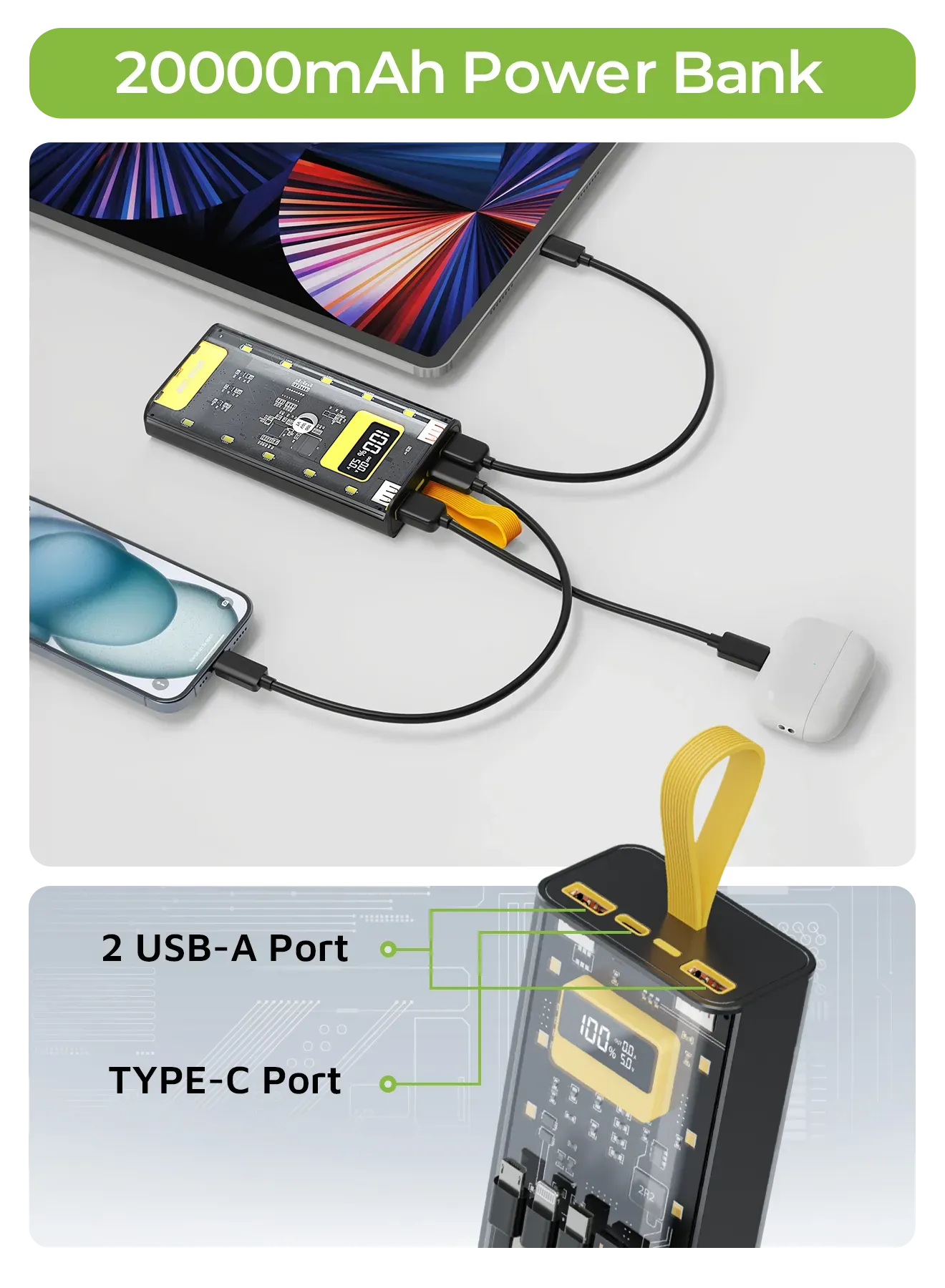 این پاوربانک ۲۰۰۰۰ از ترکیب مواد مقاوم ABS+PC ساخته شده که ضمن حفظ زیبایی، دوام بالایی نیز دارد. طراحی شفاف و ترکیب رنگ مشکی و زرد، ظاهر خاص و جذابی به پاوربانک بخشیده و آن را از سایر لوازم جانبی گوشی متمایز کرده است.