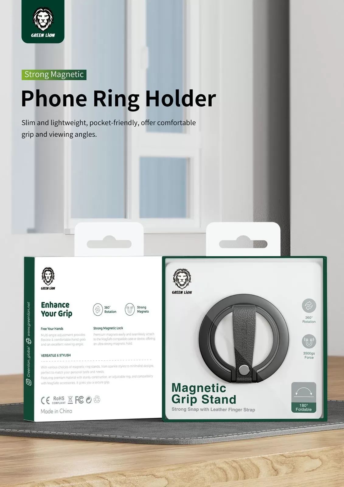 نصب هولدر گرین لاین بسیار ساده است: کافیست بخش مغناطیسی آن را به بخش پشتی گوشی یا قاب سازگار با آهن‌ربا نزدیک کنید تا جذب مغناطیسی انجام شود. سپس با استفاده از بند چرمی، گوشی را نگه‌دارید. برای تماشای محتوا، هولدر را تا ۱۸۰ درجه باز و در جهت دلخواه تنظیم کنید؛ همچنین قابلیت چرخش ۳۶۰ درجه اجازه می‌دهد زاویه مناسبی انتخاب شود. برای استفاده یک‌دستی یا گرفتن فیلم نیز می‌توانید از حالت بند چرمی بهره ببرید.