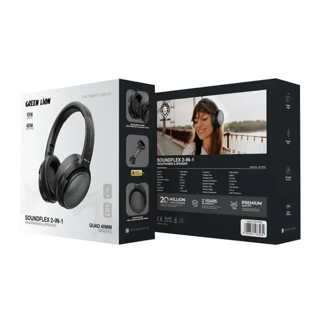 هدفون Green Lion SoundFlex 2 in 1 یک محصول ترکیبی است که هم به عنوان هدفون بلوتوثی و هم به عنوان اسپیکر قابل استفاده است. این ویژگی دوکاره باعث می‌شود در وضعیت‌های مختلف مانند گوش دادن شخصی یا پخش موسیقی برای جمع انعطاف‌پذیری بیشتری داشته باشید. در استفاده به عنوان هدفون، امکان تجربه صدای شخصی و عایق‌سازی بهتر فراهم است و در حالت اسپیکر، می‌توانید موسیقی را برای چند نفر به اشتراک بگذارید.