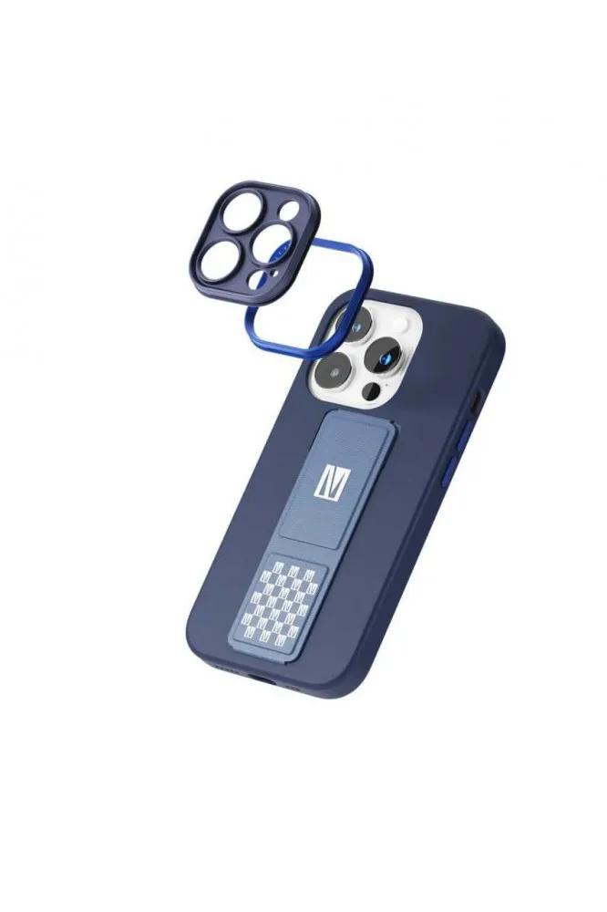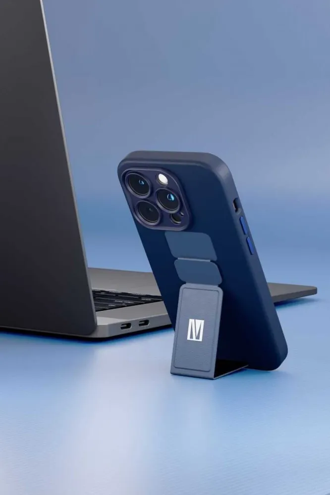 Levelo Morphix Silicone Case with Leather Grip Stand for iPhone 14 Pro – Navy Blue