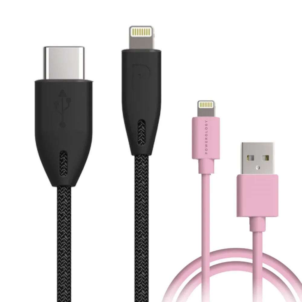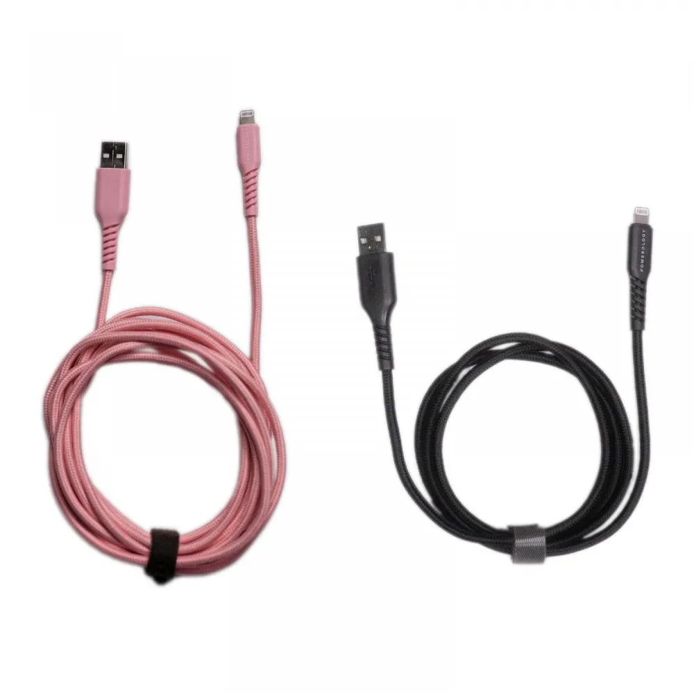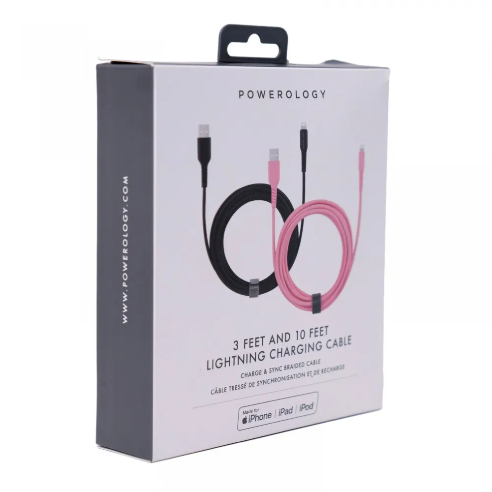 Powerology Braided Lightning Cable Set: 3ft ( Black ) + 10ft ( Pink Clay )